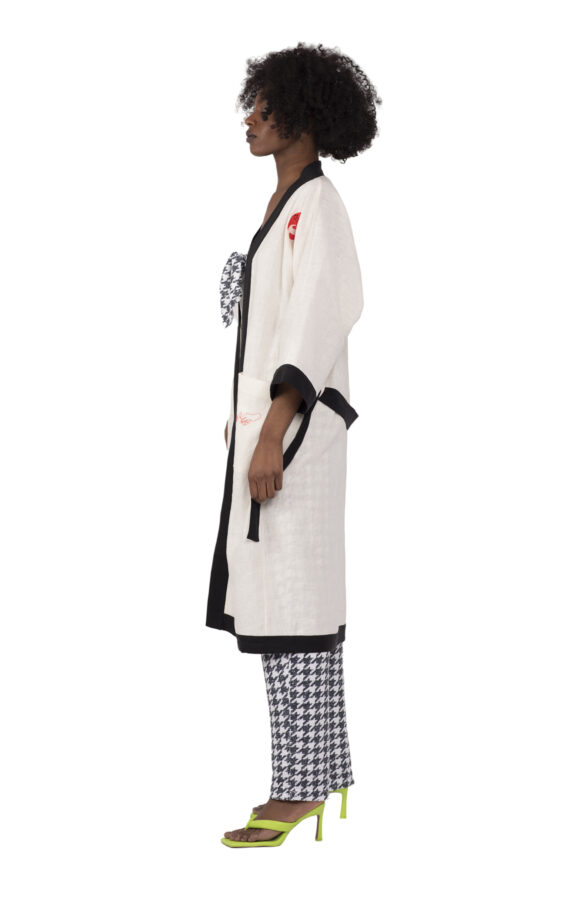 Featuring a unique embroidery , removable belt, generous functional pockets , flowy sleeves , super-soft feel , this robe is just as cozy and it is stylish.